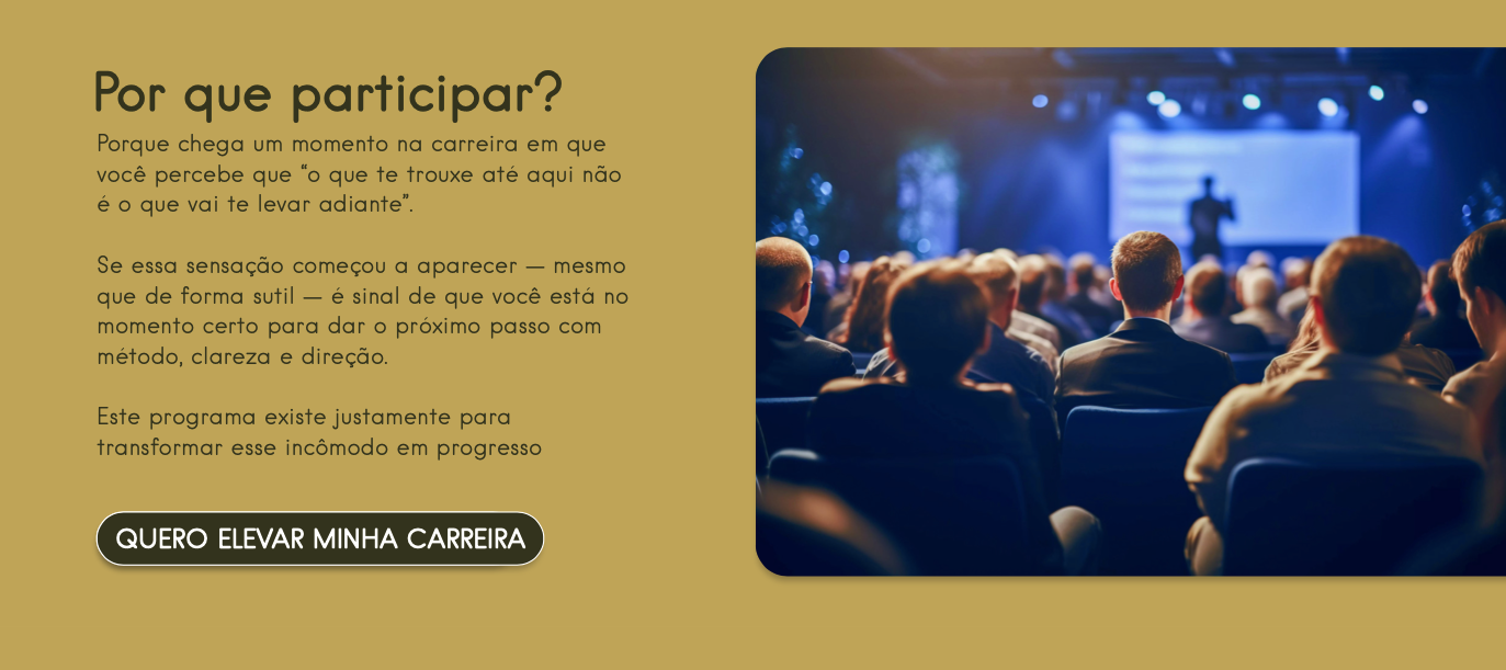 Durante dois dias de imersão, você constrói um plano estratégico de crescimento, fundamentado em frameworks de liderança contemporânea, análises de trajetória e práticas de visibilidade executiva